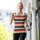 First-time purchasing one of my a design from my own shop for myself. Was thrilled with the lovely fabric (nice, soft, smooth like cotton, but it’s poly!) Fit like a dream and sits nicely in the sides and hips. Loving the smooth, nicely sewn trim at arms and neckline (see pix). Thanx for a job well done! — Di. Also thrilled that the black IS black which looks great with the snappy white fabric—the pattern is well-printed and very flattering on me. The subtle pussywillows in the design are perfect. Kudos to the print company and sewists! — Di