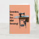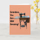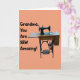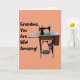 This card features a soft peach background that feels gentle and comforting, like a quiet afternoon spent together ❤️. On the right side sits an antique-style sewing machine, its dark metal body accented with small golden details and a shiny golden spool that catches the eye. The machine rests in a reddish-brown wooden cabinet with a smooth work surface and two drawers, suggesting careful hands and thoughtful gifts made for loved ones. Below, a black cast-iron stand shows curled metal scrollwork, a foot pedal, and a large spoked wheel, adding a tender, timeworn charm. On the left side, rounded black lettering reads, “Grandma, You Are SEW Amazing!” with “SEW” in all caps for emphasis. The spacing leaves plenty of open peach space between the words and the machine, like a warm pause in a friendly conversation 🌼. Fine lines and highlights make the metal parts look slightly glossy, while the cabinet’s wood grain appears smooth and polished. The wheel’s spokes and the curled ironwork stand out in crisp black against the peach backdrop.