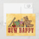 Colorful wordart in red and white paisley patterned material, and a whimsical graphic of a cute bear sitting by an open basket full of sewing tools. The perfect design for yarnoholics and sewing addicts!