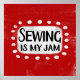"Sewing Is My Jam" is a fun text design with a white accent shape surrounded by white whimsical textured dots.