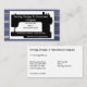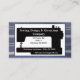 This customizable business card features a silhouette of a sewing machine. The sewing machine is in black. Your company name and contact information are written in white on the sewing machine. The company address is written in black under the arm. There is room for more contact information on the back. The sewing machine is on a white background. The outside border is a photograph of blue striped cotton shirt fabric. You can change the colors of the text and background. You can also switch out the photograph of the fabric for cloth that represents your business. A good card for tailors, seamstresses, dressmakers, alterations, fashion designers, embroiderers, costumers, quilters, and any other business involving sewing. It could also be for those who repair or sell sewing machines. And fabric stores.