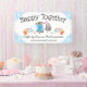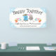 Cute man spool of thread with sewing needle and woman thimble in love on this craft show booth display banner for a wall or hanging from a table, perfect for a seamstress, quilter or quilted crafts.