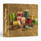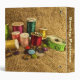 This colorful binder displays the tools of the seamstress. Bright spools of thread in rainbow colors of green, red, pink, turquoise, yellow, gold, blue and orange stand beside a measuring tape, thimble, buttons and pins. All are set on an image of a brown burlap pattern background. The image is repeated on the back. The text on the spine reads: Sewing Patterns. You can customize or delete it.