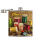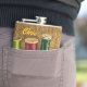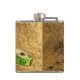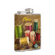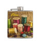 Easily change the name or remove it entirely on this colorful hip flask which displays the tools of the seamstress. Bright spools of thread in rainbow colors of green, red, pink, turquoise, yellow, gold, blue and orange stand beside a measuring tape, thimble, buttons and pins. All are set on an image of a brown burlap pattern background.