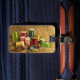 Make your luggage stand out on an airport carousel with unique tag designs! This colorful fine art luggage tag displays the tools of the seamstress. Bright spools of thread in rainbow colors of green, red, pink, turquoise, yellow, gold, blue and orange stand beside a measuring tape, thimble, buttons and pins. All are set on an image of a brown burlap pattern background. Customize the text on the reverse side with your personal information.