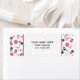 An address label featuring a sewing themed design consisting of a sewing machine, spools of thread, a pin cushion, scissors, fabric swatches, and sewing needles. Design has a pink color scheme.