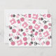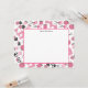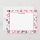 A flat notecard featuring a sewing themed design consisting of a sewing machine, spools of thread, a pin cushion, scissors, fabric swatches, and sewing needles. Design has a pink color scheme.