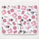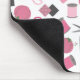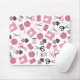 A mousepad featuring a sewing themed design consisting of a sewing machine, spools of thread, a pin cushion, scissors, fabric swatches, and sewing needles. Design has a pink color scheme.