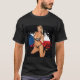 My 11 yo wore adult XL (5’7” 165#). The 8yo is small framed. She wore adult small and tied it in the back. Grandma wore adult large with long sleeve shirt underneath. Tall girl adult medium. Dark haired male adult large. Good quality dark Heather gray, Gildan brand shirt. -it was next up from basic choice and cost about $20 per shirt. Not too thick or thin. Washed and dried well, no major shrinkage. Not see-through. Can wear a bra under it fine. Screen print is just as shown and well done, front and back.