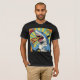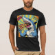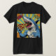 This T-shirt features a bold, colorful graphic of a muscular shark enjoying a slice of pepperoni pizza in a fun, cartoonish style. The design has a comic-book vibe, with vibrant rays in the background and words "SHA!" and "PIZZ!" in playful, dynamic lettering. The shark, drawn with exaggerated features, is posed as if relishing the pizza, adding a humorous twist. The shirt's dark base color makes the bright illustration pop, making it a great choice for anyone with a quirky sense of humor or a love for both sharks and pizza.