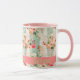 This vintage shabby-chic illustration design features a customizable area for a name on the pink scallop placed on an old-fashioned background adorned with flowers in shades of light green, cream, light and dark pink, and touches of peach. This design is a lovely addition to other collections of mugs in my store, making it ideal for introducing a refreshing spring vibe into your home. Whether used for enhancing your morning coffee routine or for entertaining guests at a tea party, this mug brings a touch of sophistication to any occasion. Additionally, it is an excellent gift option for special occasions like Mother's Day or a friend's birthday. Great as placeholders for your next girls' dinner party, corporate gifts, and church ladies' night.