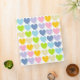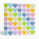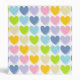 Abstract digital art of pastel rainbow colored hearts with their lighter color mimicking a shadow from each one. Colors include pink, gold, ecru, lime green, pastel blue, blue/grey, and lavender.