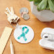 Food allergy awareness button with teal ribbon key chain. Ribbon is made of shades of teal colors. Designs by Lil Allergy Advocates ww.lilallergyadvocates.com