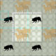 A black shadow silhouette of a Border Collie works a group of four sheep in brown silhouette. The background is cedabb Olive Green.