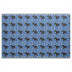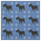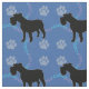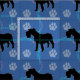 A black shadow silhouette style Schnauzer on a background of blue with paw prints and tracks of gray, blue and pink.