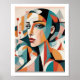 Captivating cubist portrait featuring a mysterious woman in Picasso's iconic geometric style. This striking modern artwork reveals feminine beauty through angular fragments and haunting shadows.