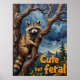 This atmospheric painting features a raccoon with its striking facial mask, clinging to a branch in a dimly lit tree. The background is a moody blend of dark blues and greys, with a touch of ethereal light filtering through. The text "CUTE BUT FERAL" stands out in white, bold letters at the bottom, emphasizing the contrast between the animal's appearance and its wild spirit.