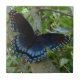 In shadows of lilac bush is the black and blue wings of a resting butterfly .