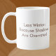 Brighten your day with this playful coffee mug that reads, "Less Winter: Because Shadows Are Overrated." Perfect for Groundhog Day enthusiasts or anyone who dreams of shorter winters and more sunshine. Whether you're sipping your morning coffee, tea, or hot cocoa, this mug adds a touch of humor and seasonal charm to your routine. It’s an ideal gift for those who love witty, weather-themed designs and practical drinkware. Start your day with a smile and some warmth!
