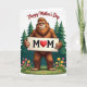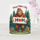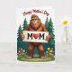 Designed with a friendly woodland scene, the front features a large shaggy, upright forest creature with rich brown fur, a soft grin, and a pink nose that gives it an affectionate, almost hug-ready look ❤️. It stands centered in the frame, holding a pale wooden sign close to its chest as if offering it to someone it cares about. The sign reads “MOM” in dark lettering, with a red heart taking the place of the “O,” making the message feel tender without needing anything else. On both sides, tall deep-green evergreen trees rise like a quiet backdrop, gently framing the character. Along the bottom edge, bright green grass spreads out with small wildflowers in pink, yellow, and orange, adding a springtime touch 🌼. Across the top on the white background, red lettering curves in an arc, placed above the creature’s head for easy reading. Two matching evergreens flank the scene while the flower-dotted grass forms a colorful band at the base.