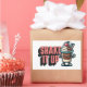 Cute cartoon chocolate shake mascot with the text, "shake it up." Chocolate milkshake with whipped cream and a cherry on top cartoon.