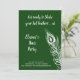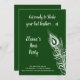 A large peacock feather decorates this Hens Party Invitation on an emerald green background with the cute saying, Get Ready to Shake your Tail Feathers! making it perfect for a night on the town dancing to celebrate the bride.