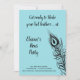 A large peacock feather decorates this Hens Party Invitation on an turquoise, blue background with the cute saying, Get Ready to Shake your Tail Feathers! making it perfect for a night on the town dancing to celebrate the bride.