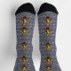 The original artwork by ZoeSPEAK on these Crew Socks features a portrait of the author William Shakespeare. The portrait rests in an original illustration of an ornate, oval gold frame with ribbons and a crown on top. The blue background wallpaper is decorated with castles, kings' crowns and yellow and red flowers, bringing to mind the romance, tragedy and comedy of his plays and poetry.
