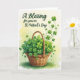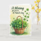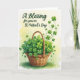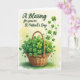On the front of the card a sturdy brown wicker basket sits low in the scene, brimming with shamrocks in layered shades of emerald and lime green 💚. The clovers crowd together like a friendly little gathering, with a few leaves leaning toward each other as if sharing a quiet secret. Slender vines trail up and to the right, each one carrying small, neatly shaped shamrocks that seem to reach toward the message above. The background is a pale green wash with a hint of soft yellow, like early morning light across a garden clearing. Near the top, the phrase “A Blessing for you on St. Patrick’s Day” is placed in flowing green lettering, centered and easy to spot. The rich greens against the earthy basket create a gentle contrast, and the upward sweep of the vines adds a touch of motion, like a shared walk under spring branches ☘️. Small shamrocks continue along the vine as it curves toward the upper-right corner, set against the light green-and-yellow backdrop.