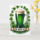 This card features a tall glass of emerald-green ale at the center, catching soft highlights that make it look cool and freshly poured 💚. A thick white foam cap spills gently over the rim, and tiny bubbles rise through the green drink like a quiet toast between friends. Around the glass, a wreath of three-leaf shamrocks forms a natural frame, with curving vines linking each clover in a way that feels like an easy arm-in-arm embrace ☘️. The shamrocks are shaded with light and shadow to give them depth against the bright white background. Beneath the mug, a golden banner stretches across the lower portion, adding a warm contrast to all the green. On the banner, the words “THE IRISH ALE” sit centered in dark serif letters that stand out clearly. The mug’s handle has a gleaming metallic look, and the banner’s folds show gentle highlights and shadows along its edges.