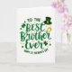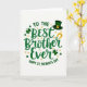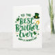 At the center of the card is a rich green message reading “TO THE BEST Brother Ever,” set on a bright white background that keeps everything crisp and easy to spot. The lettering has a smooth, flowing look, and the smaller word “Brother” sits neatly within the line, like a gentle emphasis that feels close and affectionate 💚. Just below, “HAPPY ST. PATRICK’S DAY” curves in a simple, easy-to-read style, also in green, forming a soft arc that frames the main words. In the upper right, an emerald leprechaun hat with a shiny gold buckle tilts as if it’s been set there with a friendly wink ☘️. Along the right side, a gold horseshoe adds a warm metallic touch that balances the green text. Shamrocks of different sizes are scattered around—some filled in, some outlined, and some shown as small starburst-like shapes—giving the layout a light, drifting motion. The overall arrangement guides your eyes in a loose circle from the hat to the headline and down to the curved holiday line. Small green clovers and tiny spark-like accents dot the white space around the words, with gold details standing out on the right.