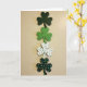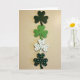 Designed with a cozy St. Patrick’s Day mood, this card features four shamrock decorations arranged in a neat vertical line along the right side, set against a warm beige wall. Soft indoor light falls across them, and the gentle shadows make the shapes look slightly raised, like they’re hanging close together. The top shamrock is deep emerald with a glittery surface that catches the light, followed by a lighter lime green one that adds an easy, friendly contrast 💚. Next comes a bright white shamrock dotted with green polka dots, giving it a sweet, almost flirty look beside the greens above and below ☘️. The bottom shamrock returns to a darker green base, sprinkled with lighter green and blue-green dots that feel like confetti. A short St. Patrick’s Day greeting sits on the left in medium green lettering, leaving plenty of open space so the shamrocks feel like the main focus. The four shamrocks form a tidy cascade with distinct textures, from sparkling green at the top to dotted patterns near the bottom. Share St. Patrick’s Day sentiments with someone you care about, and let the beige background and soft shadows frame the vertical row of shamrocks.