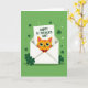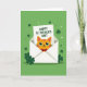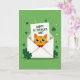 This card shows an orange tabby cat in a simple cartoon style peeking out from a white envelope, as if it’s popping in to say hello to a close friend 💚. The cat’s big emerald-green eyes and slight smile feel like a warm, flirty glance, and a small red bow tie adds a dressed-up touch. Behind it, the background is a rich Irish green scattered with darker green shamrocks and tiny white starbursts that look like little sparks in the air ☘️. A white note rises from behind the cat, centered in the design, with “HAPPY ST. PATRICK’S DAY!” printed in strong green letters across the top half. The envelope sits near the bottom center, with a soft shadow underneath that gives it a bit of depth against the flat green field. Warm orange fur, crisp white paper, and green accents keep the scene bright and easy to read, like a small moment shared between two people who care about each other. Dark green shamrocks drift around the cat and envelope, with white starbursts sprinkled between them on the green background.