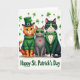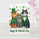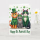 Designed with three stylish, humanlike cats lined up across a white background, this St. Patrick’s Day scene is sprinkled with floating green shamrocks ☘️. On the left, an orange tabby in an emerald top hat with a gold buckle and tiny shamrock stands in a cozy green knit sweater, its bright green eyes turned toward the others like it’s in on the joke. In the center, a smooth grey cat wears neon green sunglasses, and a small red heart emblem near its chest adds a gentle, affectionate touch. On the right, a black-and-white tuxedo cat wears a green suit jacket with gold buttons, a white shirt, and a green bow tie, leaning into the group’s friendly, dressed-up mood 💚. The overall lighting stays soft and even, keeping the cats and shamrocks crisp against the white space. Any greeting text would sit neatly above the trio in green, with a shorter line below in matching green to balance the layout. Around their hats and shoulders, the shamrocks drift like confetti, with a few scattered near the top corners and along the sides.