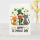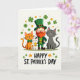 On the front of the card a smiling leprechaun stands in the center in green clothes with an orange beard, surrounded by three cats in a cozy, friendly lineup 💚. To his left, an orange cat in a green bow tie sits close to a small white cat that holds a shiny gold coin as if showing it off to a trusted friend. To his right, a smooth grey cat looks on calmly, adding a gentle, steady presence to the group. The background is a creamy white, with soft light that keeps the shapes simple and easy to see. Small shamrocks and gold coins drift around the characters, giving the scene a light St. Patrick’s Day sparkle ☘️. Along the lower area, a green base grounds the illustration, and above it the message “HAPPY ST. PATRICK’S DAY” appears in large green letters. Tiny floating shamrocks and coins dot the open space around the characters.
