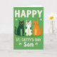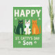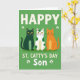 This design shows three cartoon cats sitting close together on a rich green background sprinkled with small white shamrocks ☘️. One cat is a deep emerald green, the middle cat is white with shamrock-green spots, and the third is a warm ginger tabby, all with yellow eyes and pink noses that make them look friendly and a little smitten with each other 💚. Their bodies are lined up side by side, and the slight tilt of their heads toward one another adds a gentle, affectionate feel to the scene. At the top, the word “HAPPY” appears in creamy white letters, centered above the cats. Near the bottom, “ST. CATTY’S DAY” is set in the same creamy white, large and easy to read. Beneath that, the word “Son” appears as a smaller line, also in creamy white, with a soft shadow that helps it stand out. The green backdrop stays solid and simple, while the white shamrocks are scattered evenly around the cats like confetti.
