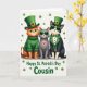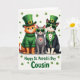 This greeting card shows three dressed-up cats standing close together on a white background sprinkled with small green shamrocks ☘️. On the left, a ginger tabby with bright green eyes wears an emerald knit turtleneck and a green leprechaun top hat with a gold buckle, leaning in as if posing with friends. In the middle, a sleek grey cat sports lime green sunglasses and a tiny red heart pinned on its chest, adding a sweet, affectionate touch between the trio 💚. On the right, a black-and-white tuxedo cat matches the party look with green sunglasses, a green top hat, and a green tuxedo jacket with a bow tie, angled slightly toward the others like it’s sharing the moment. The greens range from deep emerald to sharp lime, standing out against the cats’ fur and the bright white space. Along the bottom, the message “Happy St. Patrick’s Day Cousin” sits centered in green lettering. Scattered shamrocks dot the background around their hats and shoulders, leaving plenty of open white space between the little clovers.