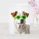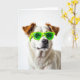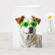 This card features a mostly white dog centered on a bright white background, with warm russet-brown ears standing upright as if it’s listening closely to a friend. It wears neon green sunglasses, and each lens shows a black shamrock that adds a cheeky St. Patrick’s Day touch ☘️. Crisp, even lighting brings out the soft texture of fur around the muzzle and chest, while the glasses look smooth and shiny beside the dog’s glistening dark nose. The dog’s calm, knowing pose feels like it’s sharing a private joke with someone just out of frame, turning the scene into a quiet moment of friendship 💚. A short St. Patrick’s Day greeting sits near the top in green lettering, balanced so it doesn’t crowd the portrait. The simple background keeps the focus on the dog’s face and the bright glasses, with white, earthy brown, and electric green doing most of the work. The final detail is the black shamrock shapes centered in each green lens, standing out sharply against the reflective surface.