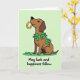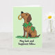 This card shows a brown cartoon dog sitting on a pale green background, head tipped slightly upward as if watching someone it trusts walk into the room 💚. Green shamrocks rest across its neck and torso, like festive little decorations that feel almost like a friendly gift placed with care. A golden horseshoe is held gently in its mouth, catching the light and adding a warm contrast to the dog’s earthy fur. The dog sits on a darker green patch that reads as a small grassy mound, keeping the scene grounded and simple. The dog’s soft expression and attentive posture suggest a sweet bond, like it’s waiting patiently to share a quiet moment with a close friend ☘️. Centered below the illustration, the message “May luck and happiness follow” appears in black text. The pale green backdrop stays uncluttered so the dog, shamrocks, and horseshoe stand out clearly. The horseshoe’s curved shape and shine sit neatly against the dog’s muzzle, with the shamrocks clustered around its chest and side.