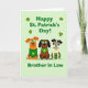 This greeting card shows three cartoon dogs standing shoulder to shoulder across the center on a pale green background, like a soft spring wash. Above them, “Happy St. Patrick’s Day!” sits near the top in deep emerald green letters, with small shamrocks sprinkled around like little lucky accents ☘️. The left dog is orange and wears a ribbed green sweater with a gold shamrock on its chest, leaning in as if eager to be part of the group. In the middle, a chocolate-brown dog in green-framed glasses sports a green bandana marked with a shamrock, smiling straight ahead with a friendly, welcoming look 💚. On the right, a white-and-brown dog wears matching green glasses and a green collar with a tiny gold shamrock charm, standing close enough to feel like a warm trio. Near the bottom, “Brother in Law” appears as a smaller line of text in green, centered under the dogs. The right dog’s lower half is shaded with subtle green striping, echoing the holiday colors.