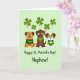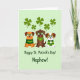 This greeting card shows three stylish cartoon dogs lined up on a pale pistachio background, with small emerald shamrocks drifting above them ☘️. On the left, a caramel pup with chocolate ears wears green glasses and a dark green sweater marked with three clovers, leaning slightly toward his friends as if posing for a photo. In the middle, a chocolate-brown dog with matching green glasses flashes a grin with a pink tongue, his green bandana tied neatly at the neck with a single clover that draws the eye. On the right, a white-and-russet patched dog in green glasses wears a green-and-white striped sweater with a tiny white flower, tucked close to the others in an easy, friendly way 💚. The trio’s wide eyes and small smiles feel like a shared inside joke, with their shoulders nearly touching to suggest closeness. Below the dogs, dark green lettering reads “Happy St. Patrick’s Day!” with “Nephew!” placed underneath in the same dark green. Above them, the floating shamrocks are spaced like confetti, and the green accessories repeat across the three outfits for a coordinated look.