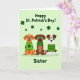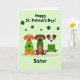 This greeting card shows three cartoon dogs lined up on a pale green background sprinkled with small, dark green shamrocks ☘️. On the left, an orange dog in a green sweater with a shamrock on the chest wears bright blue glasses and smiles as if leaning into the group. In the middle, a chocolate-brown dog wears a green bandana marked with a large shamrock and matching green glasses, standing close like a steady friend. On the right, a white-and-brown patched dog wears a striped green sweater and green-rimmed glasses, completing the trio with an easy, welcoming grin 💚. Across the top, the phrase “Happy St. Patrick’s Day!” sits in green lettering, centered above their heads. At the bottom, the word “Sister” appears centered in green, tucked beneath their paws like a label for the scene. The dogs face forward with slightly different ear shapes and eyewear, and the scattered shamrocks dot the background evenly behind them.