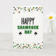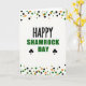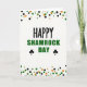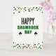 This card features the large headline “HAPPY SHAMROCK DAY” centered on a bright white background, with “HAPPY” and “DAY” in black and “SHAMROCK” in rich green 💚. The letters have a friendly, slightly uneven sans‑serif look that feels like it was written with extra care for someone special. Beneath the words, two black shamrock silhouettes sit side by side, balanced and close enough to suggest a quiet togetherness, like friends leaning in for a photo. The open white space keeps everything airy, letting the message breathe without crowding the design. Small confetti-style dots gather along the top and bottom edges, framing the greeting like a gentle celebration around the couple of shamrocks ☘️. Those dots vary in size and appear in black, green, and warm orange, giving a subtle nod to Irish flag colors without taking over the page. The layout stays symmetrical and centered, with the shamrocks directly under the text and the dotted borders forming soft bands at the top and bottom. Two black shamrock shapes rest beneath the green “SHAMROCK,” while scattered black, green, and orange dots line the upper and lower margins on the white field.