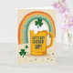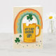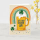 This design shows a large golden beer mug centered on a creamy, parchment-toned background, topped with a thick cap of foam and a single dark green shamrock rising from it ☘️. Above the mug, a layered rainbow arches across the upper area in earthy orange, warm gold, and soft sage green, with bands decorated by tiny white dots and gentle wavy patterns. The mug’s rounded shape and the jaunty shamrock feel like a friendly nudge to clink glasses with someone you like, leaning into a flirty, buddy-comedy kind of celebration 💚. Across the front of the mug, the phrase “LET’S GET LUCKED UP!” sits in deep blue lettering, centered and easy to read against the golden glass. The background stays light and warm, letting the rainbow and mug stand out without crowding the scene. Near the lower corners, small shamrocks and confetti-like dots scatter in greens, orange, and navy, as if the party is just starting to spill into the frame. Fine grain and speckling run through the whole illustration, and the rainbow’s dotted bands sit above the mug while the scattered shapes cluster mostly along the bottom.
