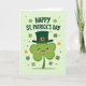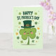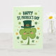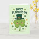 Designed with a cheerful St. Patrick’s Day scene, the center features an anthropomorphic three-leaf clover in deep emerald green, eyes gently closed as if sharing a sweet laugh with someone close by 💚. Its cheeks are softly blushed pink, and a tall forest-green leprechaun hat sits on top with a gold buckle across the band, adding a festive touch. The background is a pale lime green that keeps the main character easy to spot and gives the whole card a light, airy setting. Across the top, “HAPPY ST. PATRICK’S DAY” appears in dark green, set in rounded letters that arc neatly above the clover. Small darker-green shamrocks and scattered golden-orange stars float around the space, like confetti drifting through the air ☘️. A faint shadow under the clover makes it look like it’s hovering slightly above the background, as if leaning in for a friendly greeting. Share St. Patrick’s Day sentiments with someone you care about, surrounded by tiny shamrocks and warm golden stars on a pale green field.