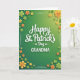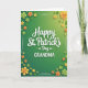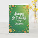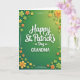 This card features a rich emerald green background that softly lightens toward the center, like a gentle glow behind the greeting. In the middle, the main line reads “Happy St. Patrick’s Day” in flowing white lettering, with “Grandma” placed just below in a simpler white font that feels close and familiar. Thin white lines form a neat frame around the words, keeping the focus on the message while adding a tidy border. Around the edges, shamrock-like flowers scatter in different sizes, mixing leafy greens with sunny yellow and soft orange for a festive look ☘️. Small shadows under the blooms make them look as if they’re resting on the surface, and a few centers sparkle like tiny dots of light 💚. The border of clover flowers circles the card evenly, leaving the brightest green space open around the centered text. Some blossoms tilt slightly inward at the corners, with the white frame lines running straight and steady around the message.