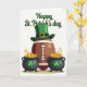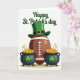This greeting card centers on an American football in warm brown, wearing an emerald leprechaun hat with a gold buckle, like a fun nod shared between friends 💚. On both sides, two black cauldrons sit evenly spaced, each stuffed with bright gold coins that spill upward and outward as if caught in mid-toss ☘️. A green shamrock decorates the front of each pot, tying the two sides together and echoing the hat’s color. Near the top, the phrase “Happy St. Patrick’s day” is placed above the scene in deep green lettering that follows a gentle curve across the white space. The plain white background keeps the focus on the strong contrast between the dark pots, the rich greens, and the shiny gold. The mirrored layout feels like a matched pair, as if the two pots are facing each other in friendly competition while the football stands between them. Gold coins appear at different heights around both pots, with a few floating near the centerline beside the football and hat.