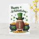 This design shows an American football in warm brown with white laces, topped with an emerald leprechaun hat with a dark band and a gold buckle, as if the hat is leaning in for a friendly, teasing pose 💚. Two glossy black cauldrons sit on either side like close companions, each overflowing with gold coins that tumble onto a pale green patch below ☘️. A small bright-green shamrock decorates the front of each pot, tying the pair together across the center. Above the illustration, the words “Happy St. Patrick’s Day” appear centered near the top in deep green lettering, standing out against the white background. Scattered shamrocks float around the text and across the open space, adding movement without crowding the scene. The football and hat form the main focal point, while the matching pots create balance and a cozy, side-by-side feel. The coins shine in yellow-gold tones as they spill outward in little arcs from both cauldrons onto the light green ground.