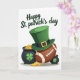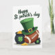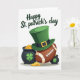 This greeting card shows a white background with an emerald-green top hat perched at a jaunty angle on an American football, like two friends leaning in for a photo 💚. A black band and gold buckle wrap the hat, and the football’s brown surface and laces sit centered beneath it. On the left, a larger black cauldron marked with a green shamrock brims with gold coins, while on the right a smaller pot peeks from behind the football, adding a cozy, side-by-side balance ☘️. Coins spill across the lower edge, and soft shadows beneath each object make them look gently grounded on the page. Across the top, the words “Happy St. Patrick’s Day” appear in a handwritten-style line of green text, arcing slightly above the hat and football. The Irish symbols and the football share the space like a lighthearted pairing, with the pots framing the center as if they’re keeping close company. The gold coins gleam in small highlights along the bottom, scattered between the two cauldrons and under the football.