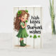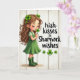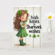 This card shows a sweet St. Patrick’s Day illustration with a young girl placed on the left side of a tall layout, set against a lightly textured white wooden plank wall. Her long brown hair falls in soft waves and is tucked with several green shamrocks, drawing your eye to her calm face and rosy cheeks. With her eyes gently closed, she holds a three-leaf clover up to her lips like a quiet kiss, giving the moment a tender, affectionate feel 💚. She wears a deep green pinafore over a lighter green top, and green rain boots finished with a tiny yellow flower for a springtime touch. On the right side, the phrase “Irish kisses & Shamrock wishes” appears in dark green, flowing lettering, stacked to fill the open space beside her. Three extra shamrocks in matching green are scattered around the words, tying the text and the girl together ☘️. The background remains bright and simple, with the white planks and soft shading keeping the greens and warm browns in clear focus.